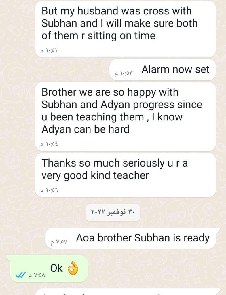 • teacher MOHAMED is great he’s teaching two of my boys and both are at different stages of arabic. This teacher is patient and makes the lessons fun. Since my eldest son has been having lessons from this teacher his Arabic had improved significantly in both understanding the language aswell as his pronunciation. This teacher is prefect to give you a head start make lessons fun and engages his students in a manner that they actually feel positive after the lesson. Arabic for Children Courses, I have become proficient in speaking, writing and reading as well.