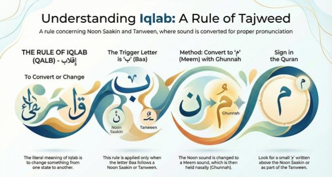 In the science of Tajweed, Iqlab Noon Sakinah occurs When a Noon Sakinah (نْ) is followed by the letter Baa (ب), the Noon sound must be turned into a hidden Meem (م). Linguistically, Iqlab means “to turn” or “to flip.