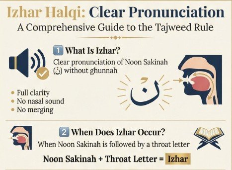 - Zero Holding Time: Unlike Ikhfa or Idgham, Izhar has no “waiting period.” The duration of the Noon should be exactly the same as any other letter with a Sukun.